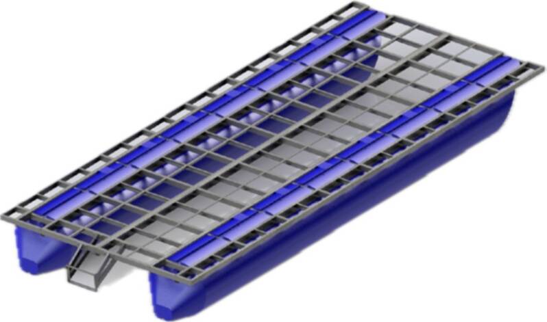 La structure la plus populaire est le catamaran. Lа, vous avez 2 rangйes de flotteurs, chaque rangée étant composée d'un flotteur avant, de plusieurs flotteurs au milieu et d'un flotteur arrière. Lorsque les flotteurs sont montés, ils ne peuvent pas bouger. La plate-forme en acier empêche les mouvements verticaux, tandis que la conception des parois verticales des flotteurs empêche les mouvements horizontaux.